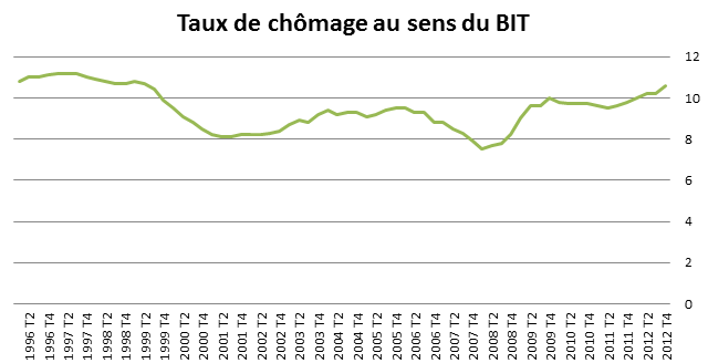 Les prévisions de croissance ont de quoi inquiéter les salariés. Souvenez-vous, lors de ses différentes interventions en décembre dernier, François Hollande avait promis une « inversion » de la courbe du chômage d’ici à la fin de l’année. Malgré la mise en place de contrats de génération et d’emplois d’avenir, la promesse semble intenable. Et pour cause : économistes, Commission européenne, tous s’accordent pour prévoitir une croissance nulle pour la France en 2013. A cela s’ajoutent les mauvais chiffres du chômage. L’INSEE dénombre 2 900 000 chômeurs au sens du Bureau International du Travail à fin 2012. Le taux de chômage est porté à 10,6 %. Le nombre de chômeurs a augmenté d’environ 150 000 en six mois.